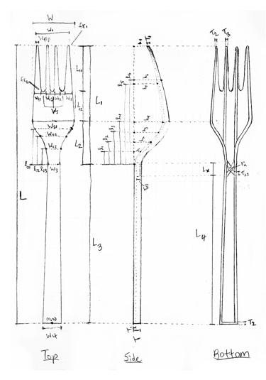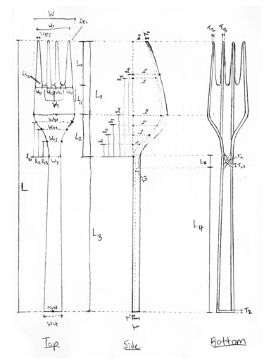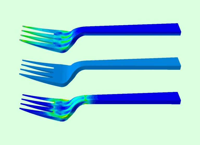 Since I had progressed the furthest with my FEA skills, I stepped up to lead our effort. First, I defined a fork model with 44 parameters - the idea being that those parameters could be adjusted to find an optimal design. Using PLA as our material, I then created the parametrized fork in Abaqus, set up 2 critical load cases for analysis, generated meshes, and automated it with a Python script.